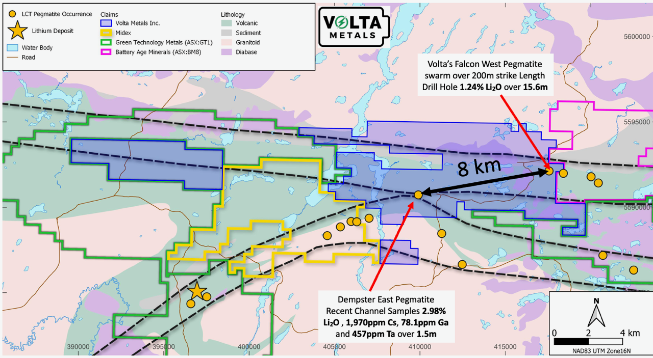 2 confirmed mineralized pegmatite swarms, Dempster East and Falcon West pegmatite swarms